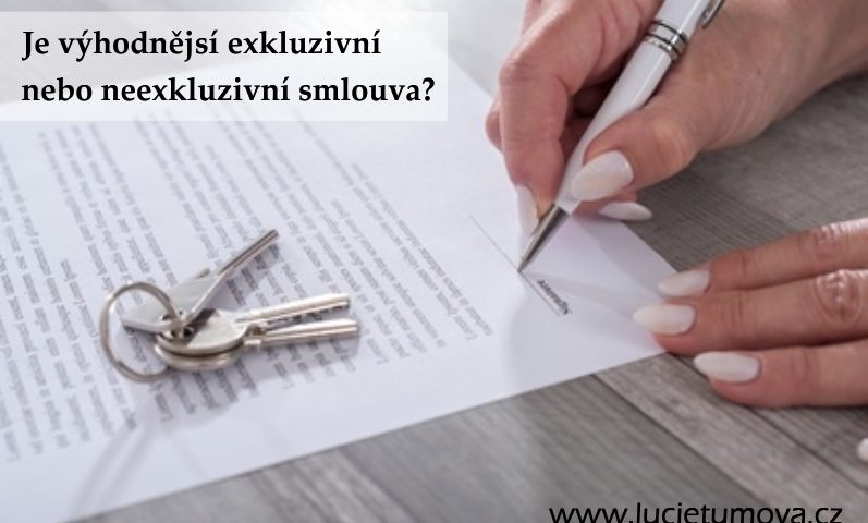Na začátku bychom si měli ujasnit, jaký je mezi neexkluzivní a exkluzivní smlouvou rozdíl. Exkluzivní smlouva je smlouva o výhradním zastoupení. Tzn. že nemovitost nabízí k prodeji jen jedna realitní kancelář a prodávající není oprávněn pověřit prodejem této nemovitosti další osoby. Ani on sám nesmí nemovitost nabízet. Oproti tomu u neexkluzivní, tj. nevýhradní, smlouvy může stejnou nemovitost nabízet k prodeji více zprostředkovatelů i sám majitel současně.